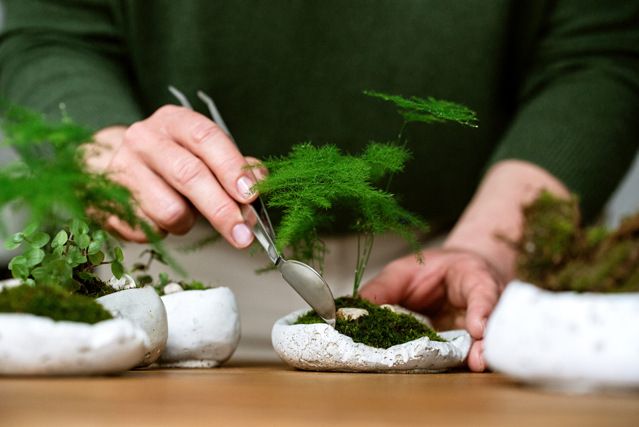 Zapewniam wszystkie materiały potrzebne do stworzenia kompozycji – rośliny, podłoże, naczynie, dodatki i narzędzia.