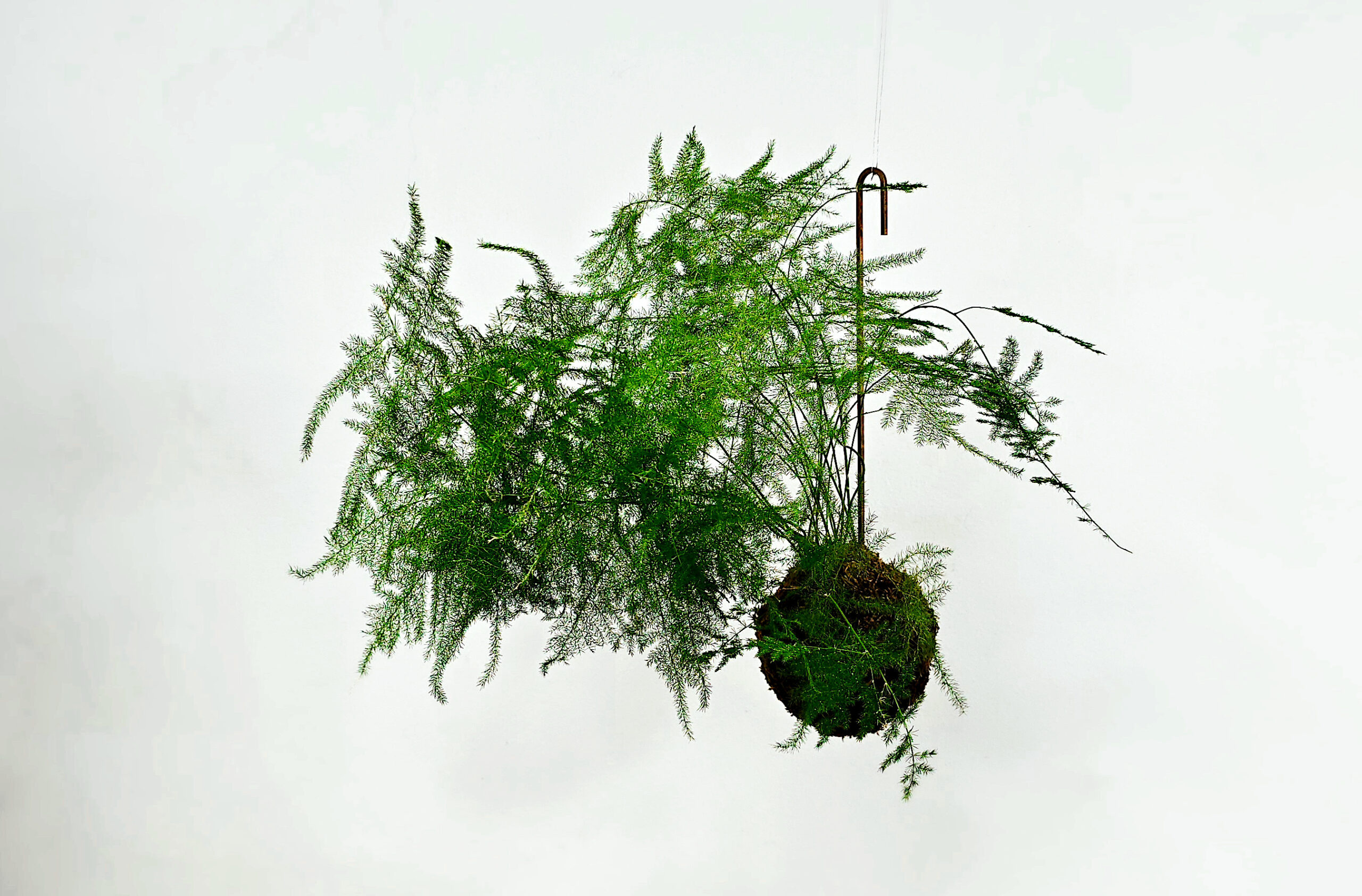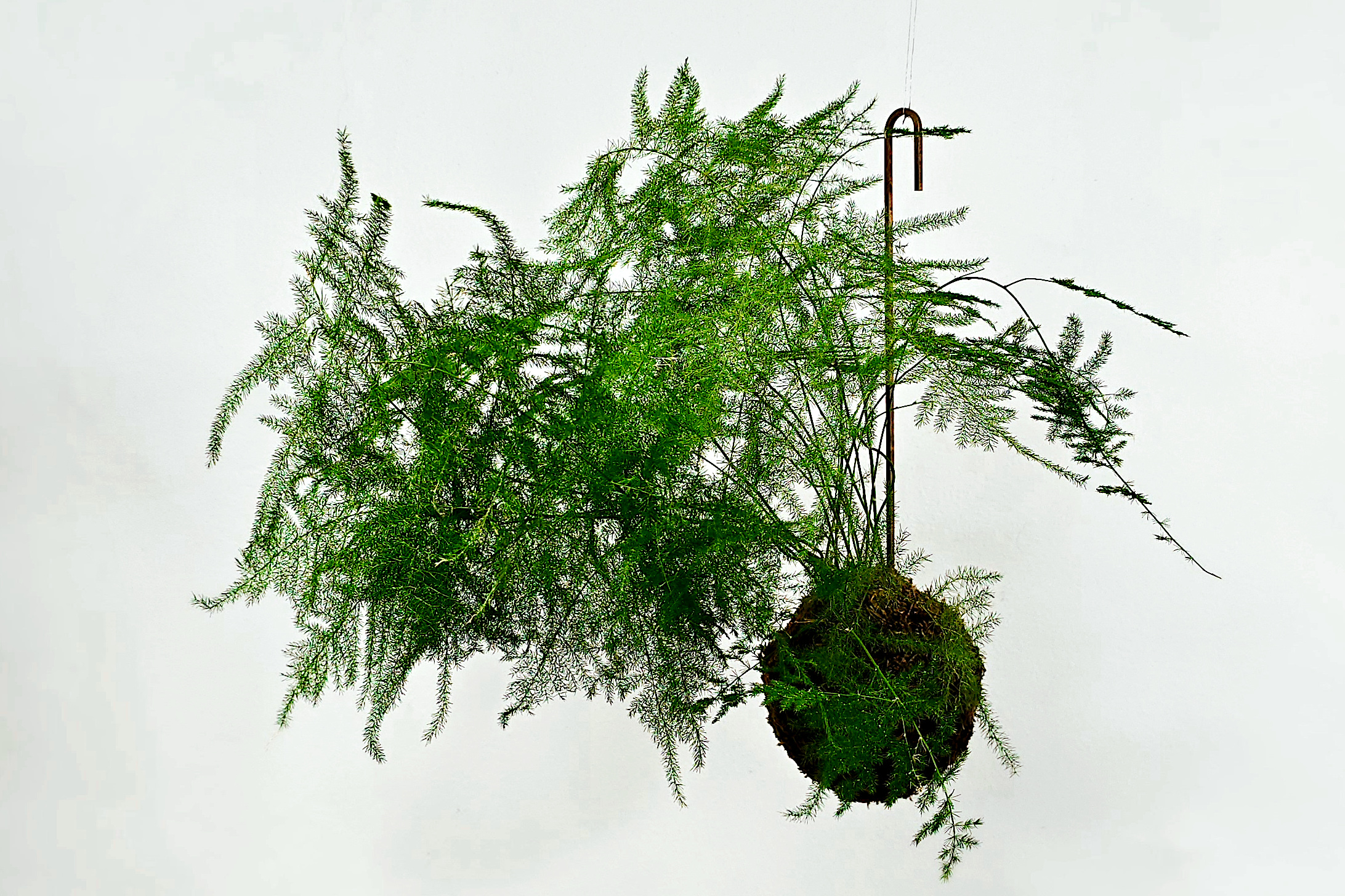 Kokedama z asparagusem pierzastym (Asparagus setaceus) w wersji wiszącej, zawieszona na mosiężnym haczyku.