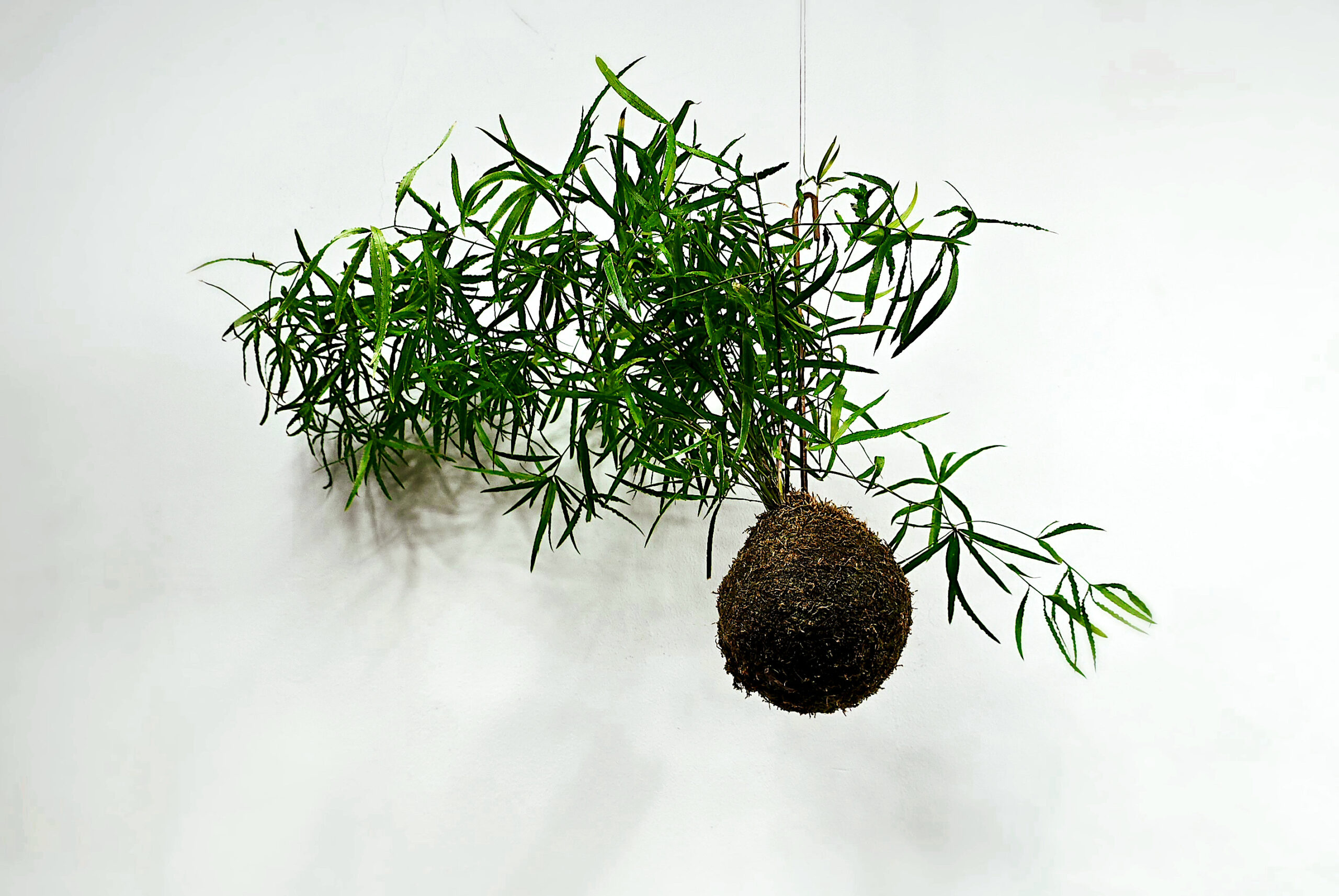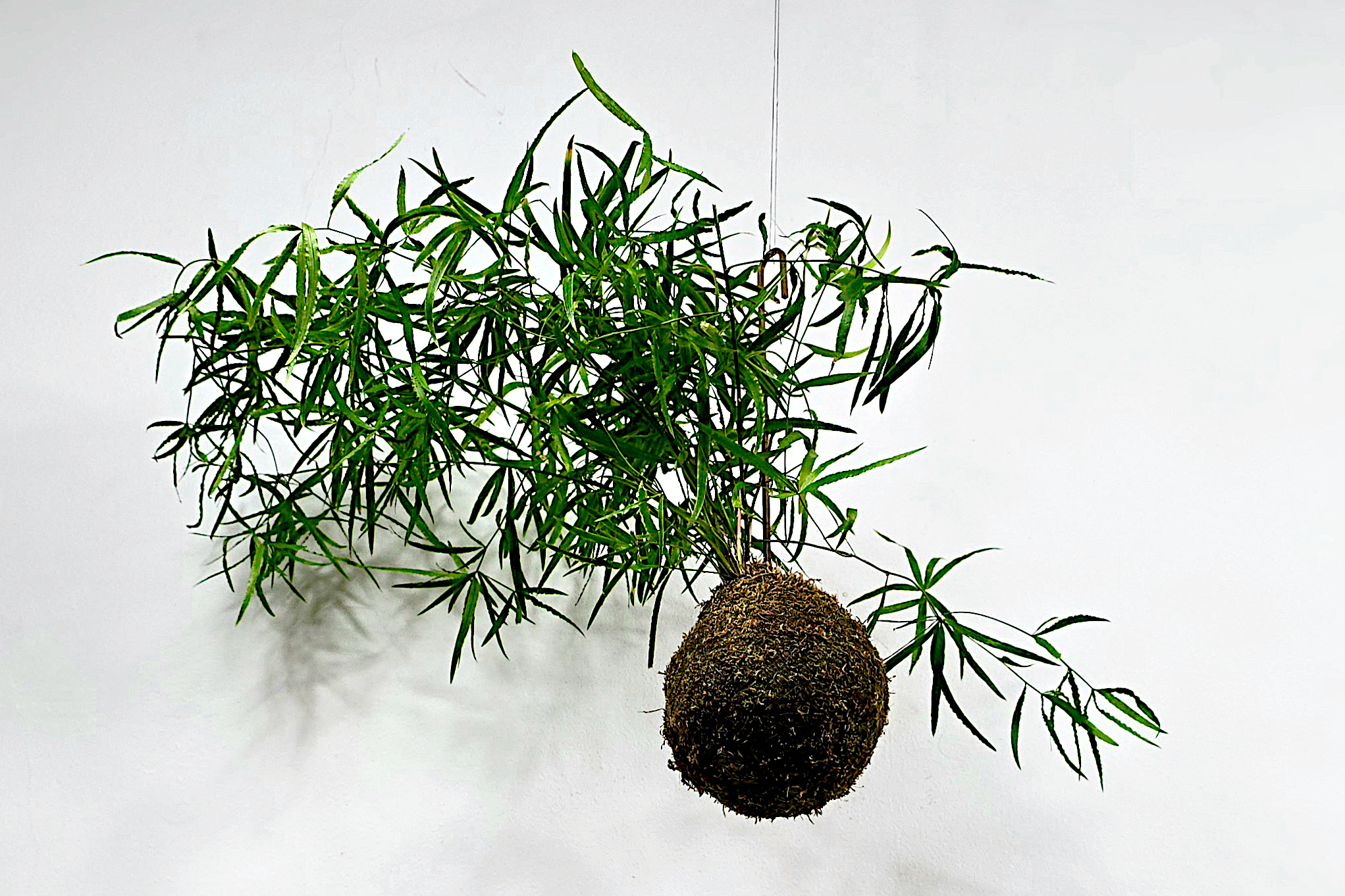 Asparagus sierpowaty tworzy cienkie, wydłużone pędy, które naturalnie rozkładają się na boki i lekko opadają. W formie kokedamy roślina rozwija się swobodnie, bez ograniczeń typowych dla klasycznej doniczki. Kula została przygotowana tak, aby umożliwić dalszy wzrost i stopniowe zagęszczanie pędów.